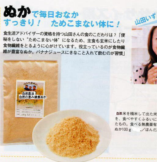 ありがとうございました、早速今朝いただきました。 毎朝スープの中に、フライパンで煎った物を大さじスプーン2ハイ、混ぜて飲みます。 もう1年以上たちます、すこぶる排便の状態が宜しく感動物です。我が家におきましては手放せない物となりました。 又すりこぎにて水を加えて摺った物を、布にて濾した物を頭皮にすり込み、十分すすぎますと髪のつやが違うことが解りました、 リンス等科学物質は頭皮及び人体には適しておりません。 また家内は食器を洗うのに、糠にて洗っています、その際手が荒れないといい重宝致しております。 ぜひこれからも、末永いおつきあいを、させてくださるようお願い申し上げます。